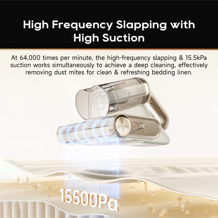 At 64,000* times per minute, the high-frequency slapping & 15.5kPa* suction works simultaneously to achieve a deep cleaning, effectively removing dust mites for clean & refreshing bedding * linen.