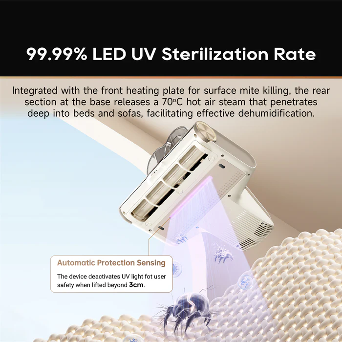 Features an embedded sensor for instant dust mite detection, providing real-time updates on cleaning status tied to dust mite and particle concentrations.